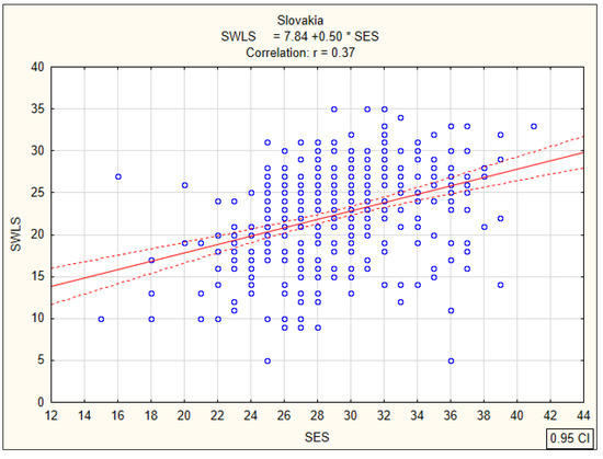 Correlation between global self-esteem according to SES and life satisfaction according to SWLS among Slovak students.