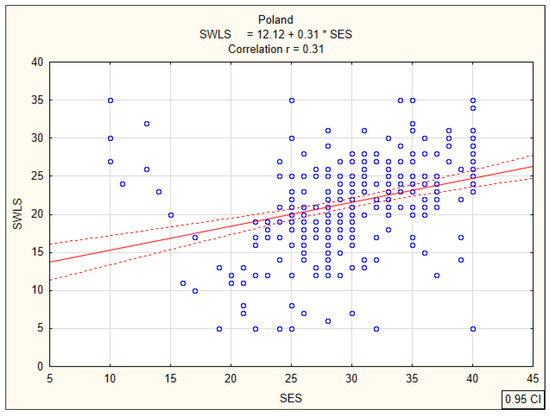 Correlation between global self-esteem according to SES and life satisfaction according to SWLS among Polish students.