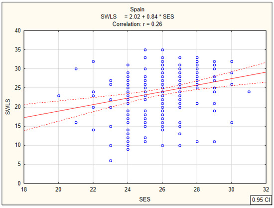 Correlation between global self-esteem according to SES and life satisfaction according to SWLS among Spanish students.