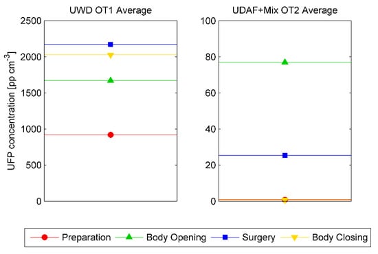 Time average UFPs concentration for UWD OT1 (left) and Hybrid OT2 (right) in orthopedic surgeries as function of surgery phases.