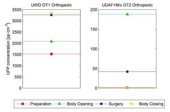 Same conclusions can be obtained by comparing the UFPs contamination level generated by the same type of surgical operation when carried out in OTs with different ventilation systems, as shown in Figure 3. In the orthopedic operation performed in OT1 (with UWD dislocation system) the results were 10 to 50 times higher than in OT2 (hybrid room), depending on the selected phase.