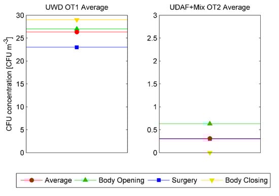 The average microbiological concentrations during surgeries, and at each surgical phase, show the effectiveness of the UDAF ventilation scheme in keeping the area protected. The final airborne microbiological contamination in OTs with low airflow rates and incorrect air diffusion is affected by the surgical phase and the size of medical team, as occurred in UWD OT1. The door opening frequency weakly influences the airborne concentration in the observed surgeries.