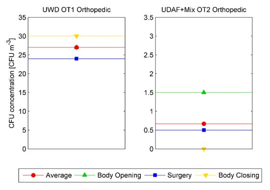 Time average CFU/m3 values for UWD OT1 (left) and Hybrid OT2 (right) in orthopedic surgeries as function of surgery phases.