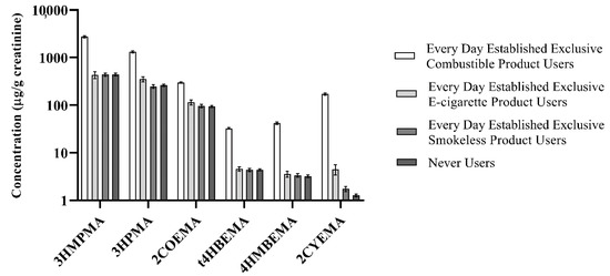 Overall, the relative abundance of VOCM GMs by tobacco user group follows the same pattern, i.e., Smokers had the highest VOCM GMs, followed by ENDS Users. Smokeless and Never Users had the lowest GMs out of the four groups and were about the same for most VOCMs. Of note, statistically significant differences between all four tobacco user group GMs were observed only for 2CYEMA and 3HPMA levels when compared to the reference group. Creatinine-ratioed 2CYEMA GMs (standard error) were as follows (µg/g creatinine): 172 (4.77) (Smokers), 4.51 (0.560) (ENDS), 1.76 (0.114) (Smokeless), and 1.27 (0.043) (Never Users). For 3HPMA, creatinine-ratioed GMs (standard error) were as follows (µg/g creatinine): 1.32 × 103 (33.0) (Smokers), 354 (22.3) (ENDS), 249 (10.1) (Smokeless), and 262 (7.66) (Never Users).