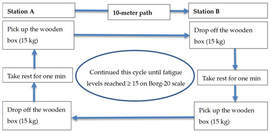 The participants were requested to perform a simulated construction task until they reached self-determined exhaustion. The simulated construction task was manual material handling, which is the most common and physically demanding construction task. Participants were asked to carry a weight of 15 kg, which is a typical weight of material being handled on a construction site [31]. The temperature and relative humidity in the laboratory were set at 30 °C and 65%, respectively. The other environmental parameters such as solar radiation and wind speed were not controlled as the current study was conducted at a basement area where the sources of solar radiation and wind speed were very limited. The simulated manual material handling task was conducted using an experimental setup as described in previous research with some modifications (Figure 1) [21,32]. Notably, the experimental setup comprised a station A, a 10-m walking platform, and a station B. Each participant was instructed to pick up a 15 kg ergonomically-designed wooden box from station A, carry it along a path of 10 m, then drop it at station B, and take a one-minute rest prior to picking up the weight and carrying it to station A again. Participants were asked to continue this task cycle until they achieved a fatigue level > 15 out 20 on Borg-20 scale (perceiving hard exertion level). The Borg-20 scale is a ‘relative’ scale for rating perceived physical exertion. It ranges from 6 (no feeling of exertion) to 20 (very, very hard feeling of exertion). The cutoff score of 15 was chosen for fatigue as Borg suggested that if an exercise test (the simulated task in this study) aims to study physiological symptoms of fatigue, the task is often stopped at a HR between 150 and 170 beats/minute for individual aged between 30 and 50 years [33]. These HRs are corresponding to Borg scale ratings between 15 and 17.