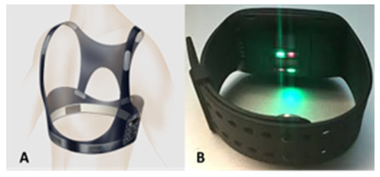 (A) Equivital LifeMonitor vest (B) E4 photoplethysmography (PPG) wristwatch (Picture reproduced with permission).