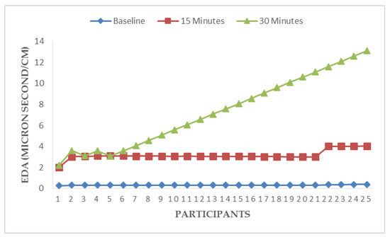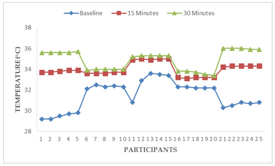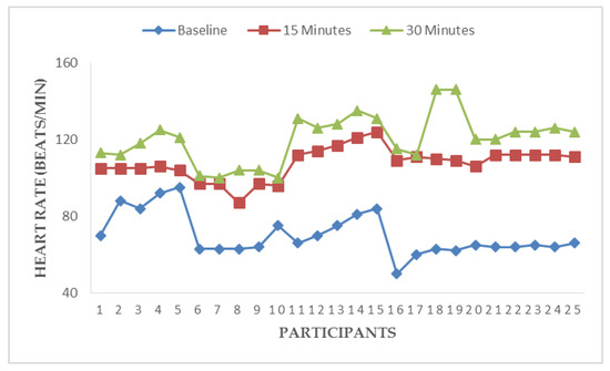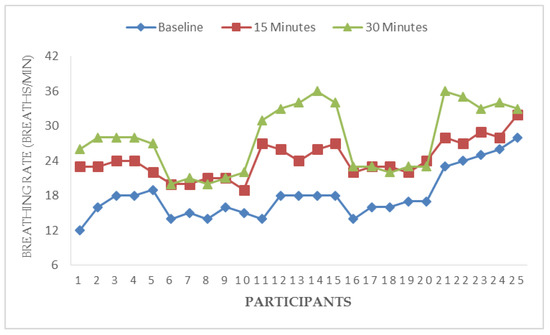 Figure 3, Figure 4, Figure 5 and Figure 6 illustrate responses of cardiorespiratory and thermoregulatory measures during the simulated task in all the participants. Participants had a minimum HR of 50 beats/min (Participant no. 16) and a maximum of 95 beats/min (Participant no. 5) at baseline. However, two participants had a minimum HR of 100 beats/min and a maximum of 146 beats/min at the end of the task (at 30 min). Additionally, participants had a minimum BR of 12 breaths/min (Participant no. 1) and a maximum of 28 breaths/min at baseline (Participant no. 5). Similarly, two participants had a minimum BR of 20 breaths/min and a maximum of 36 breaths/min at the end of task (at 30 min). Furthermore, two participants had a minimum local skin temperature of 29.2 °C and one participant had a maximum of 33.6 °C at baseline. However, one participant had a minimum local skin temperature of 33.4 °C and three participants had a maximum temperature of 36 °C at 30 min. Moreover, one participant had a minimum electrodermal activity of 0.27 µS/cm and two participants had a maximum electrodermal activity of 0.37 µS/cm at baseline. At the end of 30 min, one participant had a minimum electrodermal activity of 2.2 µS/cm and a maximum of 13.1 µS/cm.