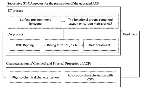 Proposed framework for Successive ST-CA (surface treatment-chemical activation) process for the preparation of the modified ACFs (Activated carbon fibers). Volatile organic compounds (VOCs).