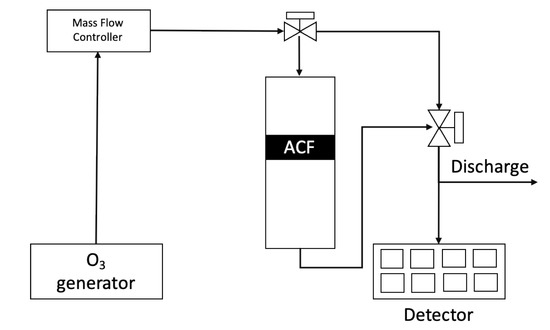 Figure 2 shows the reactor used for surface treatment using O3. The surface treatment of as-received commercial ACFs was conducted with O3 at room temperature, followed by a Pyrex tube used as reactor. O3 used for the surface treatment was generated from an industrial O3 generator and fed into the reactor packed with ACFs. The feed O3 concentration was fixed at 20 g/m3 and the outlet concentration of O3 emitted from the reactor was detected with an O3 analyzer(OZM-7000, Ozonetech, South Korea). The flow rate of O3 balanced by O2 was about 200 mL/min and the mass of the packed ACFs was about 0.8 g. The temperature of the packed ACFs layer was also monitored.