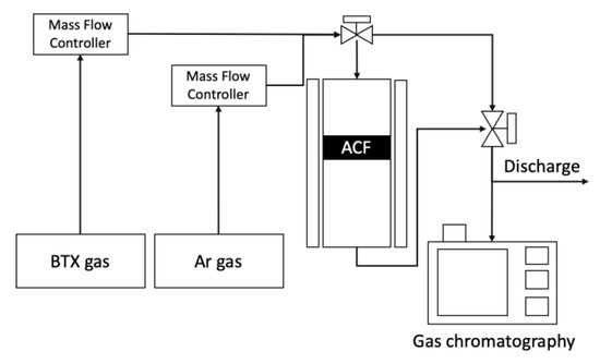 The reactor used for BTX gas adsorption–desorption experiments is shown in Figure 3. Adsorption of VOCs was performed using a laboratory scale unit to evaluate the adsorption capacity of the prepared ACFs towards benzene, toluene, and xylene. The amount of ACFs packed in a quartz-tube reactor with outer diameter(OD) of 1/2 inch and length of 40 cm, before and after the ST-CA process, was 0.05 g. Adsorption was carried out under a flow rate of 300 mL/min and a concentration of 1000 ppmv (balanced by N2) at 30 °C. Once adsorption was completed, desorption was conducted by flowing Ar gas of 300 mL/min, at 200 °C. The inlet and outlet concentrations of VOCs passed through the fixed ACFs reactor bed were analyzed by gas chromatography, equipped with an alumina capillary column and flame ionization detector (FID), in order to define the breakthrough curve for VOCs. The adsorption capacity of ACFs towards VOCs was calculated by the integration of VOC concentration until the adsorption amount was saturated. After the adsorption step was conducted by confirming the saturated adsorption of toluene, desorption to regenerate ACFs was carried out by the thermal treatment under Ar atmosphere.