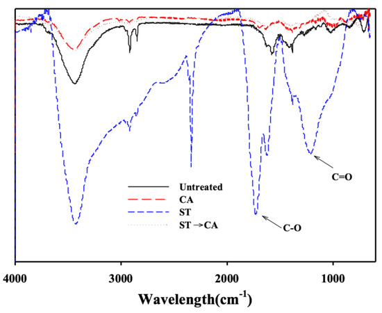 FT-IR (Fourier Transform Infrared Spectroscopy) results of ACFs ST-CA process (Untreated, untreated ACFs; ST, ACFs prepared through surface treatment; CA, ACFs prepared through chemical activation without prior surface treatment; ST→CA, ACFs prepared through chemical activation after surface treatment).