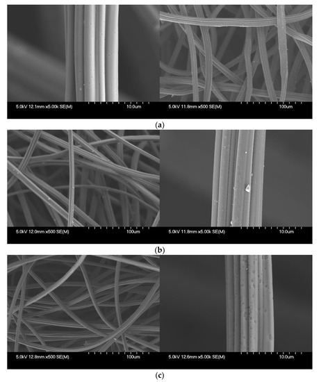 Figure 7 shows the results of surface morphology of ACFs after the ST-CA process. The observation result in a magnification of ×500 shows that the diameter of the ACFs was 11 µm on average, with no significant change before and after the ST-CA process. Observing the structure of the ACFs under a magnification of ×5000, shows that the surface of ACFs became rough after surface treatment and chemical modification. This can be seen as a result of pore development on ACFs, due to loss of carbon components through the generation and disappearance of oxygen-containing functional groups, during activation of the carbon surface.