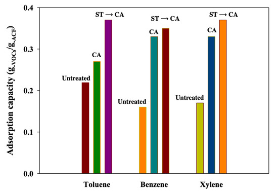Based on the improved morphological properties of ACFs after the successive ST-CA process, the adsorption characteristics of benzene, toluene, and xylene for the untreated and modified ACFs were examined. Figure 8 shows the adsorption capacity of the untreated and modified ACFs for benzene, toluene, and xylene. The toluene adsorption capacity of ACFs was raised from 0.22 to 0.27 g−Tol./g−ACFs after CA process and up to 0.37 g−Tol./g−ACFs after ST-CA process. The adsorption capacity for benzene was improved from 0.16 to 0.33 g−Ben./g−ACFs after CA process and increased to 0.35 g−Ben./g-ACFs after the combined ST-CA process. The adsorption capacity for xylene increased from 0.17 to 0.33 g−Xyl./g−ACFs after the CA process and further to 0.37 g−Xyl./g−ACFs after the ST-CA process. It was assumed that the adsorption capacity of ACFs for VOCs was improved after the CA and ST-CA processes, because the adsorption capacity of toluene, benzene, and xylene was proportionally influenced by the BET surface area and pore structure, which were simultaneously expanded and improved by the pore development through the CA and ST-CA processes. In general, morphological properties, such as BET surface area, pore structure, and VOCs adsorption capacity, were improved more by the ST-CA process, than the CA process alone. Pore development was affected more drastically from the ST process rather than the CA process.