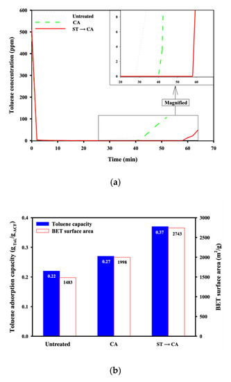 (a) Breakthrough curves and (b) adsorption capacity of ACFs for toluene and BET surface areas of ACFs (Untreated, untreated ACFs; ST, ACFs prepared in the surface treatment for 80 min; CA, ACFs prepared in the chemical activation without the surface treatment; ST→CA, ACFs prepared in the chemical activation after the surface treatment for 80 min).