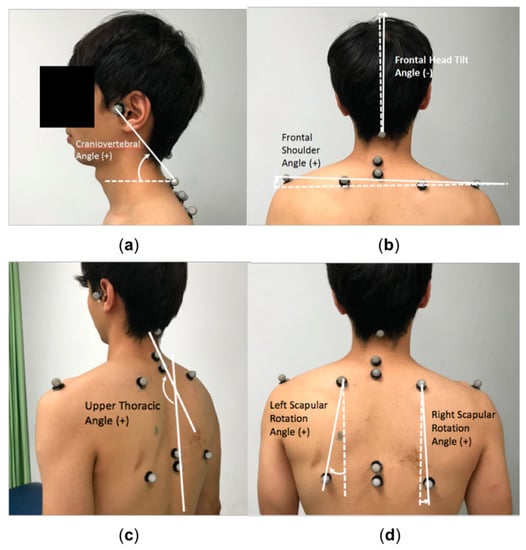 Figure 1. Marker placement and angle definition. (a) Craniovertebral angle was defined as the angle between the line connecting the tragus of the ear and the spinous process of the C7 and the horizontal line; (b) Frontal head tilt angle was defined as the angle between the midline of the head relative to the vertical line. Frontal shoulder angle was defined as the angle between the line connecting the left acromion and right acromion and the horizontal line; (c) Upper thoracic angle was defined as the angle between the line connecting the spinous processes of the T1 and T2 and the line connecting the spinous processes of the T6 and T7; (d) Scapular rotation angles were defined as the angle between the line connecting the superior and inferior scapular angles and the vertical line.