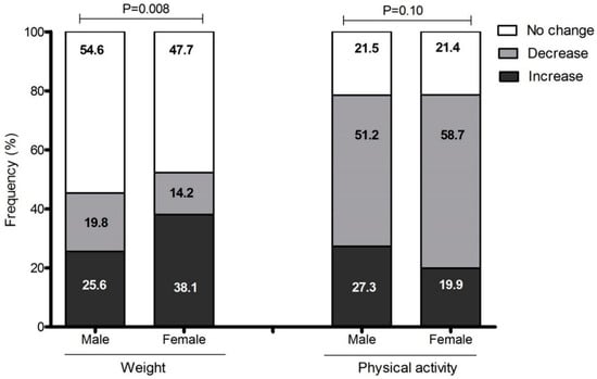 Figure 1 shows the change in body weight and PA patterns. Of the men, 25.6% and of the women, 38.1% reported an increase in body weight (men vs. women, p = 0.008); 51.2% of the men and 58.7% of the women reported a decrease in PA levels (men vs. women, p = 0.10).