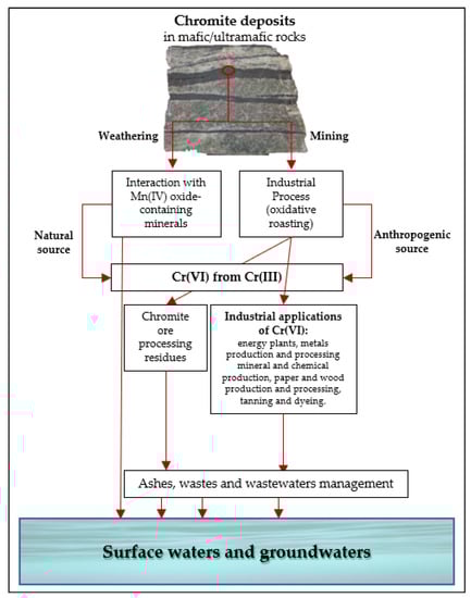 In the light of the above, hexavalent chromium concentration in groundwaters represents a combination of natural and anthropogenic factors, which are difficult to distinguish. They are summarized in Figure 1.