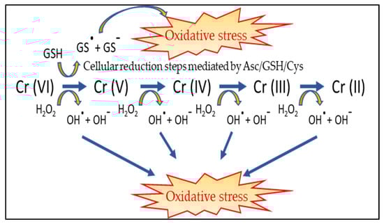 Schematic representation of free radicals formation during Cr (VI) reduction within the cell through Haber–Weiss reactions (modified from [15]). Asc, ascorbate; GSH, reduced glutathione; Cys, cysteine.