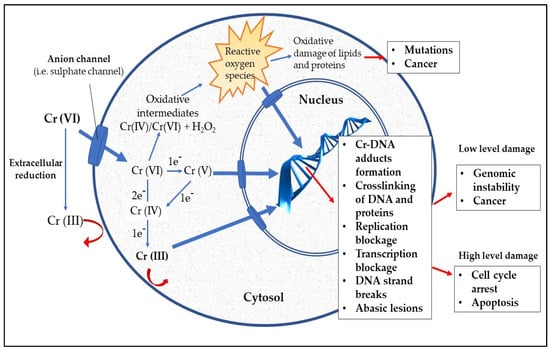 Public concerns with chromium are primarily related to hexavalent compounds owing to their toxic effects on humans, animals, plants, and microorganisms [6]. The risks for human health are dependent on dose, exposure level, and duration. A lasting and continuative exposure to chromium even at low concentration, that is, in the case of occupational exposure, can damage the skin, eyes, blood, respiratory, and immune system [7,8]. On a cellular level, the genotoxic effect of chromium leads to oxidative stress, DNA damages, and other harms that can result in tumour development [9,10].