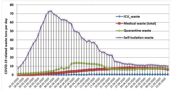 The ICU waste is included in the general COVID-19 medical waste flow as calculated by Equation (1).