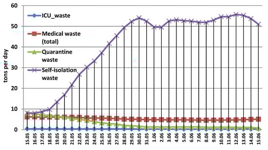 In Italy, Vaccari et al. [] found that the highest medical waste generation in departments of anesthetics (5.96 kg∙bed−1∙day−1) pediatric and intensive care (3.37 kg∙bed−1∙day−1). In Wuhan (China) the amount of medical waste peaked to 240 t per day []. Therefore, in the COVID-19 pandemic context, medical waste flow associated with intensive care patients is expected to be higher than the general average of infectious disease and upper limited detected by previous studies in Romania (1.8 kg) is further considered in the analysis.