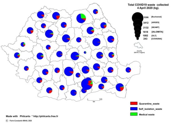 There are regional disparities regarding the amounts of infectious waste (healthcare + quarantine sources) compared to self-isolation wastes among Romanian counties as shown by the map (Figure 3), but the capital city of Bucharest is the largest contributor to the overall COVID-19 related waste flow and self-isolation waste on this regional snapshot (4 April). Furthermore, Suceava County is the largest contributor to medical waste and Constanta County for quarantine wastes.
