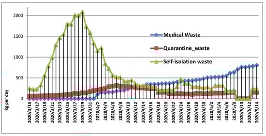 Self-isolation wastes prevailed in all periods as amounts generated, but this waste stream has a lower infectious potential being managed by ordinary municipal waste operators and disposed of in landfills. However, some local authorities treat the self-isolation wastes as quarantine wastes with special transport and disposal treatment.