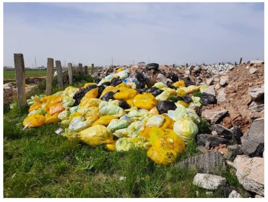 The geographic expansion of the COVID-19 outbreak around the world forced the World Health Organization (WHO) to declare the pandemic status on 11 March 2020. On 24 March, the United Nations Environment Programme (UNEP) pointed out that waste management is an essential public service in avoiding secondary impacts upon public health and environment and special attention should be paid to handle medical, household and other hazardous items in such a period []. Massive amounts of medical waste have already been generated and disposed into the natural environment [] and waste mismanagement practices can increase the contamination risks in developing countries [,] or among urban poor which live in informal settlements [,] or among hundreds of millions of people without basic water, sanitation, and waste management facilities in rural areas [].