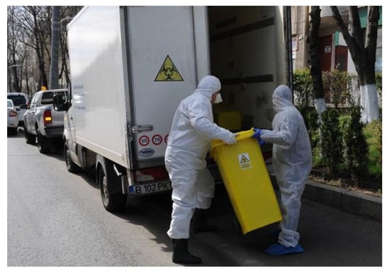 In Bucharest city, local authorities of District 4 and 6 provide special bags for waste collection of quarantine places and from self-isolated persons. District 4 bought two special vehicles (capacity of 840 L each, seven bins of 120 L) dedicated to collect and transport potential infectious wastes at −4 °C to waste incinerators from Dolj and Prahova counties []. These vehicles will cover the quarantine site and self-isolated persons with a twice collection frequency per week in District 4 of Bucharest city. The workers have full protection equipment as shown in Figure 6.