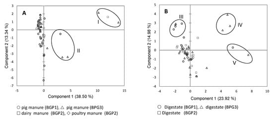 Principal components analysis (PCA) of antimicrobial resistance profiles of C. perfringens isolates from manure (A) and digestate (B) in three BGPs. Groups I to V contained highly resistant isolates.