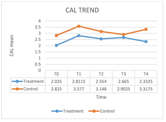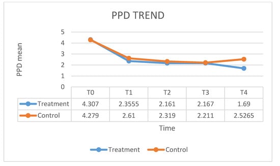 About the considered variables, the significance was observable for CAL at baseline and at 12 months, respectively: (z = −2.643; p = 0.007) and (z = −2.151; p = 0.030) at 12 months for PPD (z = −3.113; p = 0.001) and CAL (z = −2.705; p = 0.006) (Table 2).