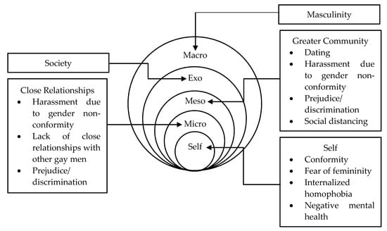 Like any individual, the socio-ecological environment of a gay man includes a complex network ranging from the macrosystem—including broader social structures and ideologies—to the microsystem—including their family and close social networks which progressively shapes (and is shaped by) the individual [,,]. Within the gay male community, heteronormative ideals play a prominent role—the rewarding of traditionally masculine behavior and stigmatization of effeminate behavior []. As a consequence, sexual minority individuals often experience negative attitudes towards their own sexuality—internalized homonegativity [].