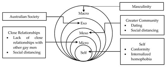 Gay men often experience a higher degree of negative attitudes, abuse, and extreme states of mind in response to internalized homophobia (e.g., suicide and homicide) [,,,] as well as greater violence and discrimination based on gender norm violation as compared to lesbian, bisexual, and genderqueer women who tend to benefit from such deviations []. Furthermore, numerous studies have made connections between internalized homophobia and depression, poor wellbeing, sexual discrimination, shame, body dissatisfaction, eating disorders, and suicidal ideation [,,,,]. Similarly, unlike cisgender men, transgender men experience a reduction in mental health issues and more positive wellbeing outcomes in relation to conformity to masculine norms []. Berg et al. [] identified that, while most literature on internalized homophobia dating 1989-2012 examines the relationship between internalized homophobia and other factors, there exists little to no empirical research on the relationship between masculine norms and internalized homophobia. Furthermore, only a maximum of eight papers were identified to originate from Australia []. Since this, Provence et al. [] identified key issues around heterophobia, internalized homophobia, and the process of coming out when examining relational barriers between straight and gay men and establishing links to gendered norms. Given the negative mental health outcomes associated with internalized homophobia and the sparsity of research explicitly examining the role and relationship of masculine norms on internalized homophobia, further investigation to identify the socio-ecological underpinnings of internalized homophobia is warranted in order to better predict the salience and impact of internalized homophobia among Australian gay men across the ecology of their environment.