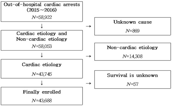The study population of this study initially included all OHCAs that occurred from 1 January 2015 to 31 December 2016. As shown in Figure 1, we first excluded cases where the etiology of OHCA was unclear or not cardiogenic. In addition, we excluded cases in which survival status was unclear, and finally 43,688 cases were selected for the study. The KOHCAR we used was approved by the National Statistical Office as a national statistic (approval number 117088), and is released to the general public through the National Statistical Office (http://kosis.kr). The raw data does not disclose any information that can estimate a specific individual based on the “Personal Information Protection Act” and “Statistics Act”. The institutional review board of the Konyang University Hospital and the KCDC approved the study protocol (KYU-2018-056-01).