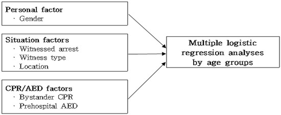 This study basically focused on prehospital factors. The initial electrocardiographic rhythm, ROSC, the response time, and the time of witnessing are important prehospital factors, but many of these items were often missing and recorded as ‘unknown’, so they were not included in the final analysis. We included six prehospital variables with complete data fidelity in the final analytical model. The independent variables were classified into the subject’s personal factors, situation factors, and CPR/AED factors. Gender was used as the personal factor, and whether or not witness, witness type, and place of event were used as the situational factors. CPR/AED factors included whether CPR was performed and whether or not AED was used (Figure 2).