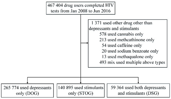Drug users were classified into DOG, SOG, and DSG according to the drug types they used. Data for individuals with a history of using drugs other than depressants or stimulants were excluded. Primary outcomes were HIV infection trends of the three groups from 2008 to 2016. Secondary outcomes were sociodemographic and geographic characteristics associated with HIV infection.