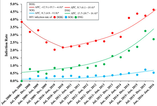 The HIV infection rate of DOG users presented a U-shaped trend which decreased from 3.85% in 2008 to 2.19% in 2010 (APC −12.9, 95% CI −19.3–−6.0, p < 0.05), then increased to 4.64% in 2016 (APC 8.3, 95% CI 6.1–10.4, p < 0.05). While the HIV infection rates of SOG and DSG users both maintained increased trends. In SOG, the infection rate increased from 0.15% in 2008 to 0.54% in 2016 (APC 8.2, 95% CI 4.8–11.8, p < 0.05). In DSG, the infection rate increased from 0.78% in 2008 to 2.72% in 2016 (APC 13.5, 95% CI 10.7–16.4, p < 0.05) (Table 2, Figure 2).