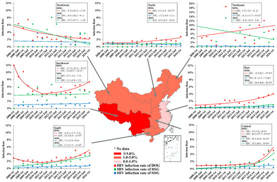 The HIV infection rate of DOG users in the Southwest was 5.93% (95% CI 5.74–6.13%), higher than other regions except for the Northeast (Table 2 and Table 3). The rate in Southwest presented a U-shaped trend, decreased from 12.00% in 2008 to 4.01% in 2011 (APC −17.2, 95% CI −25.2–−8.3, p < 0.05), then increased to 7.38% in 2016 (APC 5.4, 95% CI 0.7–10.2, p < 0.05) (Table 3, Figure 3). The HIV infection rate in four regions presented increased trends, which were South (APC 10.3, 95% CI 6.0–14.9, p < 0.05), North (APC 6.5, 95% CI 2.6–10.7, p < 0.05), East (APC 12.9, 95% CI 8.2–17.8, p < 0.05) and Central (APC 46.3, 95% CI 27.7–67.6, p < 0.05), respectively. While in the Northwest, the HIV infection rate maintained a decreased trend from 6.36% in 2008 to 2.39% in 2016 (APC −7.2, 95% CI −10.9–−3.3, p < 0.05) (Table 2, Figure 3).