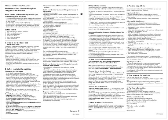 In the first round of case studies, PILs of 46 OTC medicines available in England were collected in hard copies from 16 English volunteer students at the University of Leeds. Among the PILS collected, 16 were PILs of OTC analgesics. Five of OTC analgesics contained codeine as one of the active ingredients, namely, Syndol Tables from SANOFI, Solpadeine Plus from Omega Pharma Ltd., Paramol Tablets from Reckitt Benckiser Healthcare Ltd., Co-damol Tablets from Accord, and Co-damol Effervescent Tablets from Zentiva.