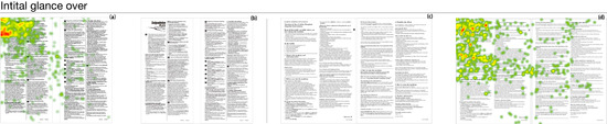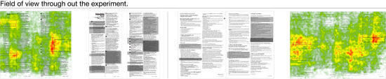 For the eye-tracking experiment of two previously selected samples, the six tasks of each sample were introduced to each participant during the experiment. The results of the eye-tracking experiment were summarized in Figure 4, Figure 5 and Figure 6 using heat-maps. Figure 4, Figure 5 and Figure 6 presented participants’ initial focus of the sample, the eye movement, and the coverage of eyesight throughout the whole experiment, respectively. The field of view was colored in the heat-map. The warmer the color gets, the better the attention was gained in the section. The correct answers for each task are boxed in the figures.