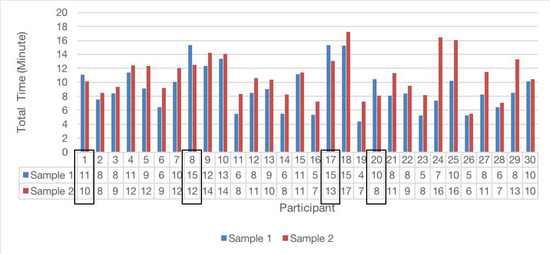Then, the total time used by each participant to find correct answers to the tasks was measured and summarized in Figure 7. The average time spent on Sample 1 was 9.1 min, and that on Sample 2 was 10.9 min. The p-value was calculated as 0.029. Therefore, information design could influence readers’ speed of finding information. In general, participants found information more quickly using Sample 1 than using Sample 2.