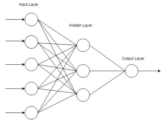 The network architecture is defined by neurons organization. An example of a neural network is presented in Figure 1. The architecture consists of an input layer, a hidden layer, and an output layer. The input, hidden, and output layers consist of five, three, and one neuron, respectively. The output of one layer is utilized as input to the next layer. The activation function in the neuron combines the inputs by multiplying with the corresponding weights. There is also a bias component in each neuron. Optimization methods are used to estimate the weights of the input (“called the training of network”) by minimizing the loss function. Several training algorithms are available; one of them is backpropagation, which is based on a gradient descent technique for parameter estimation [].