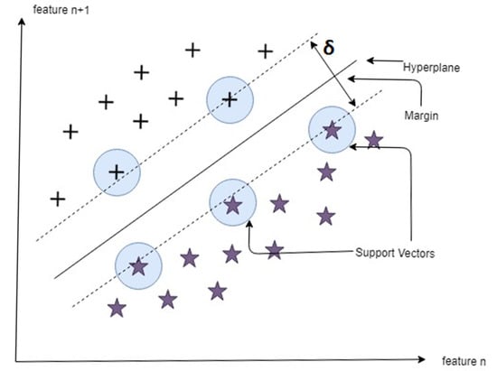 SVM is a comparatively strong machine learning technique in many fields due to its theoretical framework, which can perform more efficiently for noise mixed data compared to the conventional chaotic local models. This technique is also valid for small data sets along with global optimization and better generalization performance. Minimizing general error and maximizing the margin is the primary intent of SVM by separating hyperplane between two classes []. Figure 2 explains the general idea of a support vector machine. It has two classes of support vectors separated by a hyperplane. The points which are closest to the hyperplane are called support vectors. Support vectors are critical points that, if eliminated, would alter the position of the hyperplane. The hyperplane is a simple line classifying the data. Higher the margin between support vectors, more confident we are about the correct classification of data by the hyperplane.