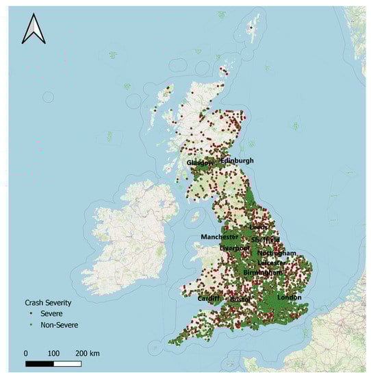 The crash dataset in Great Britain, UK, between 2011–2016 was used in this study. A random sample of crashes representing each year was used for analysis. A randomized class balancing procedure [] was followed in selecting the sample. In this procedure, a sample was randomly selected in such a way that each class had an equal number of events in the dataset to make sure that the sample was balanced without any bias towards a specific severity level. The spatial distribution of crashes for the sample is illustrated in Figure 3, representing both severe and non-severe crashes in the Great Britain (GB). From this figure, it is evident that crashes were highly crowded in London. The selected input attributes that belonged to vehicle, road, and crash are shown in Table 1. Features that could be easily identified with a little investigation on crash sites were used as an input so that the trauma center could predict the injury severity level based on the initial information provided and prepare accordingly for the treatment of the victims. The output variable was the crash severity (i.e., severe or non-severe). A crash with at least one fatality or serious injury was considered severe. The severity was reported in three levels in the original data set: fatal, serious, and slight, with a proportion of 1.5%, 15.5%, and 83%, respectively. In this research, the fatal and serious crashes were merged under one severity class, i.e., severe crash. In contrast, slight crashes were considered a non-severe crash. It should be mentioned that the following types of injuries were considered serious injuries: