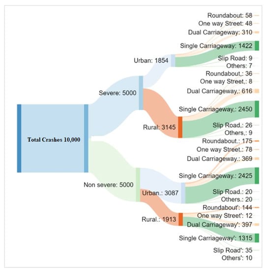 Before developing the ML models, the dataset was preprocessed to make sure that the crash dataset was clean and valid. The crash distribution with respect to area type and road type was illustrated in Figure 4. Figure 4 explains that a higher number of crashes in rural areas was severe, while urban areas mostly encountered non-severe crashes. This trend was obvious due to higher speeds in rural areas leading to severe crashes, while the speeds in urban areas are comparatively slower, minimizing the possibility of severe crashes. Most crashes occurred on a single carriageway since two-way traffic is not separated by a median, thus leading to higher chances of crashes.
