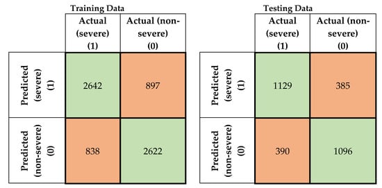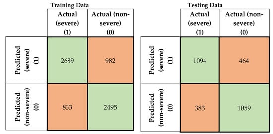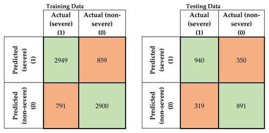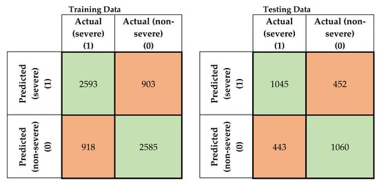 In this study, four machine-learning models were developed to predict the severity of traffic crashes. Two severity levels were considered in this study (severe and non-severe). To evaluate the developed models, confusion matrices for the training and testing data for the developed models were prepared, as shown in Figure 5, Figure 6, Figure 7 and Figure 8. To evaluate the developed models, confusion matrices for the training, and testing data for the developed models were prepared (Figure 5, Figure 6, Figure 7 and Figure 8). A confusion matrix is a simple table that is used usually to describe the performance of classification models on test data for which the true values are known. The diagonals in Figure 5, Figure 6, Figure 7 and Figure 8 running from NW to SE represent true predictions. On the contrary, diagonals running NE to SW depict false predictions. Several statistics are calculated from the confusion matrices, namely classification accuracy, sensitivity, precision, and F1 score, which are explained in Equations (5)–(10).