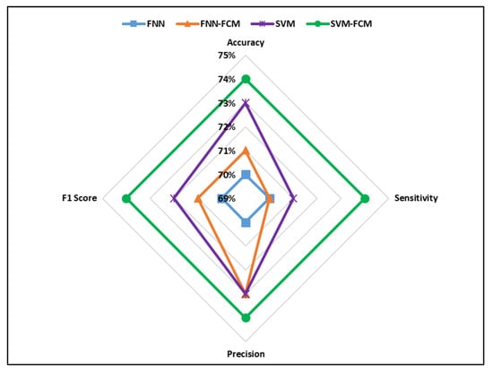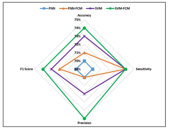 The best model has the maximum values of both sensitivity and precision. Sometimes, choosing the best classifier based on maximizing two parameters is confusing and not an easy task. Hence, for convenience, the harmonic mean of sensitivity and precision (F1 score) was introduced, which is expressed in Equation (10) [].