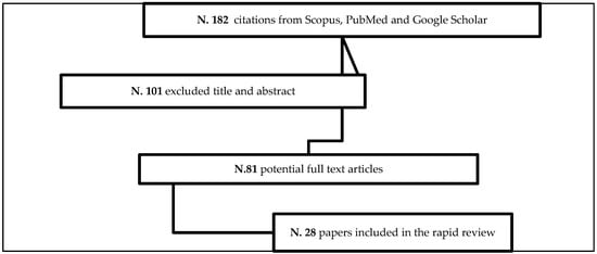 As for the first component of this study, the rapid review method was considered as more suitable—compared to the certainly more comprehensive but also much lengthier alternative of carrying out a systematic review—to ensure swiftly available results on a topic on which, in Italy and elsewhere, there is urgency to deliver evidence to inform not only the academia, but also practitioners and policy makers. Following the principles underpinning this method [22], the first author extracted articles using Google, Google Scholar, and Scopus. The search terms used were: “Occupational welfare”, “Corporative welfare scheme”, “Long-Term Care”, “Europe” and “Italy”. The search identified in a first step a total of 182 English and Italian records, excluding duplicates. The web search allowed to reduce this number in case of records linked to more than one keyword, and to understand how the concepts of “Occupational Welfare” and “Corporate Welfare schemes” were used in the literature. All records have been screened by the first author by a double check. Firstly, the selection was based on title and abstract to understand their relevance and applicability according to the eligibility criteria. Specifically, the records have been included if: (a) they had been published between 2016 and 2019; (b) the main paper’s issue was “Occupational Welfare” in Italy and in Europe; (c) they were focused on innovative work-family life reconciliation policies and practices in Italy and Europe; (d) the papers focused on either policy or practices, therefore excluding theoretical and/or methodological papers. At the end of this process, 81 papers have been full text reviewed for final inclusion, of which 28 were included in this rapid review (Figure 1). The selected papers, as a part of the study’s materials, have been included and cited in the Results section as references, and are listed in the Appendix A of this article.