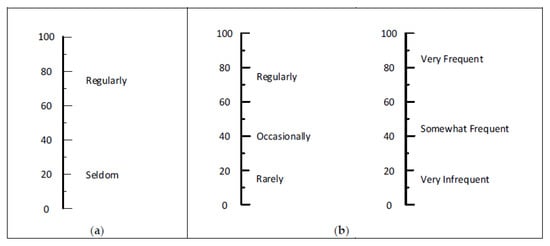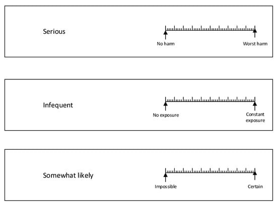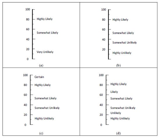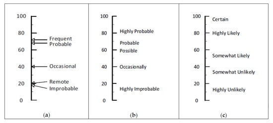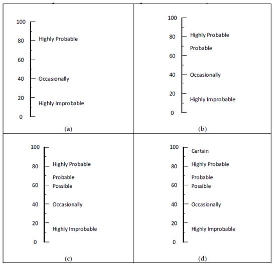 The sets in Panels a, b, and c of Figure 7 have roughly equal intervals between the words and phrases. The six-level set in Panel d is crowded on the low end. This might be useful for analyzing high-hazard processes with the goal of having four layers of protection [] (p. 123) and [] (pp. 388–397), []. For example, a particular deviation from normal involving a highly hazardous process might be initially rated as highly likely to occur in a 20-year span. With a primary engineering control, it might drop down to somewhat likely. A second engineering control might drop it to somewhat unlikely. In order to further lower the likelihood, other engineering tactics and/or planned personnel actions may lower the likelihood into the unlikely or highly unlikely category.