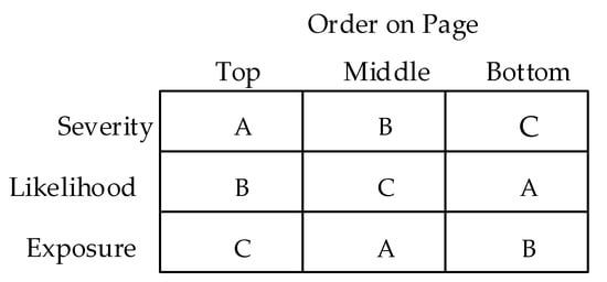 Each subject completed one booklet consisting of 16 pages. Each page had three words/phrases linked to an appropriate rating scale, as illustrated in Figure 2. The three rating items on each page consisted of one for severity, one for exposure, and one for likelihood. The position of these three rating scales on a page was ordered so as to remove the effects of position–order from the overall ratings. This was done by creating three booklets (A, B, and C) using the Latin Square design shown in Figure 3. The position on the page within a booklet had a consistent order; for example, booklet A had severity in the top position, exposure in the middle position, and likelihood in the bottom position (see Figure 2).